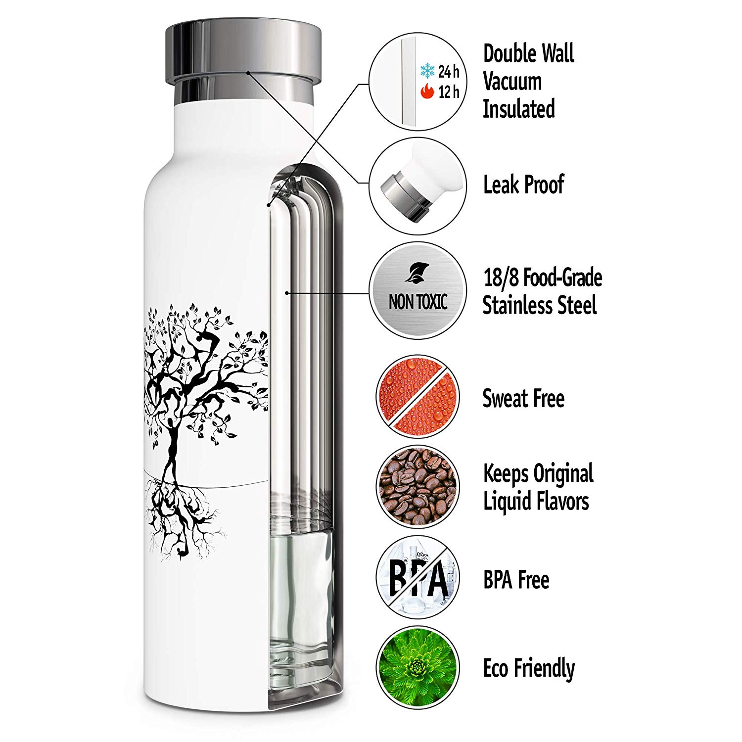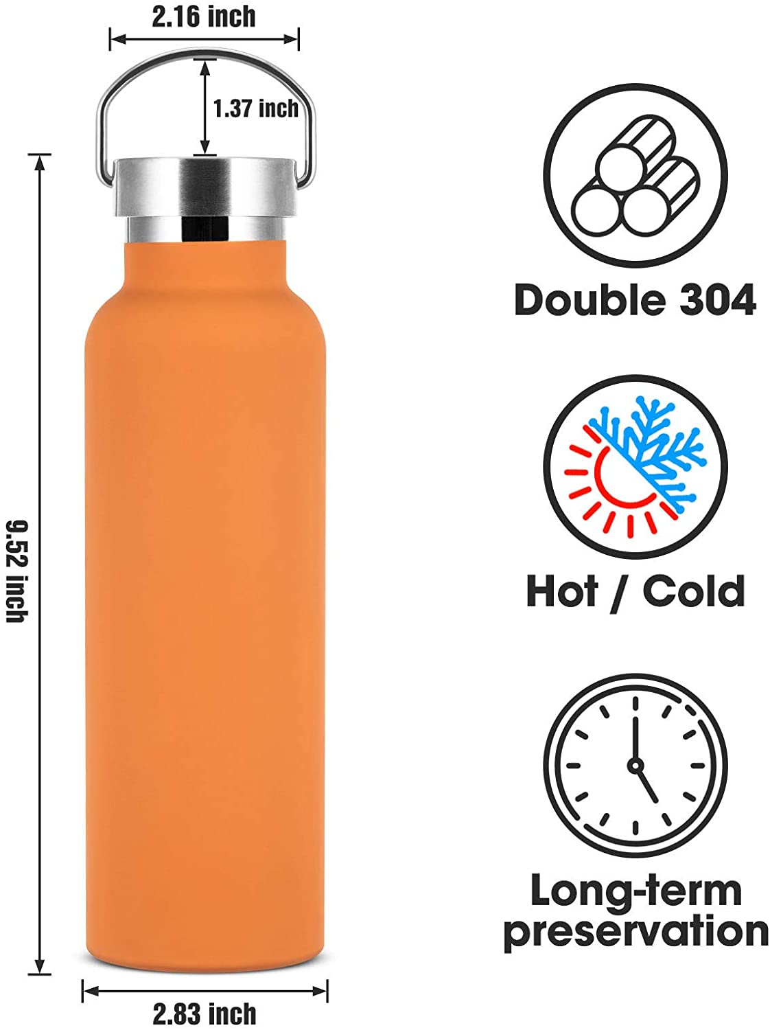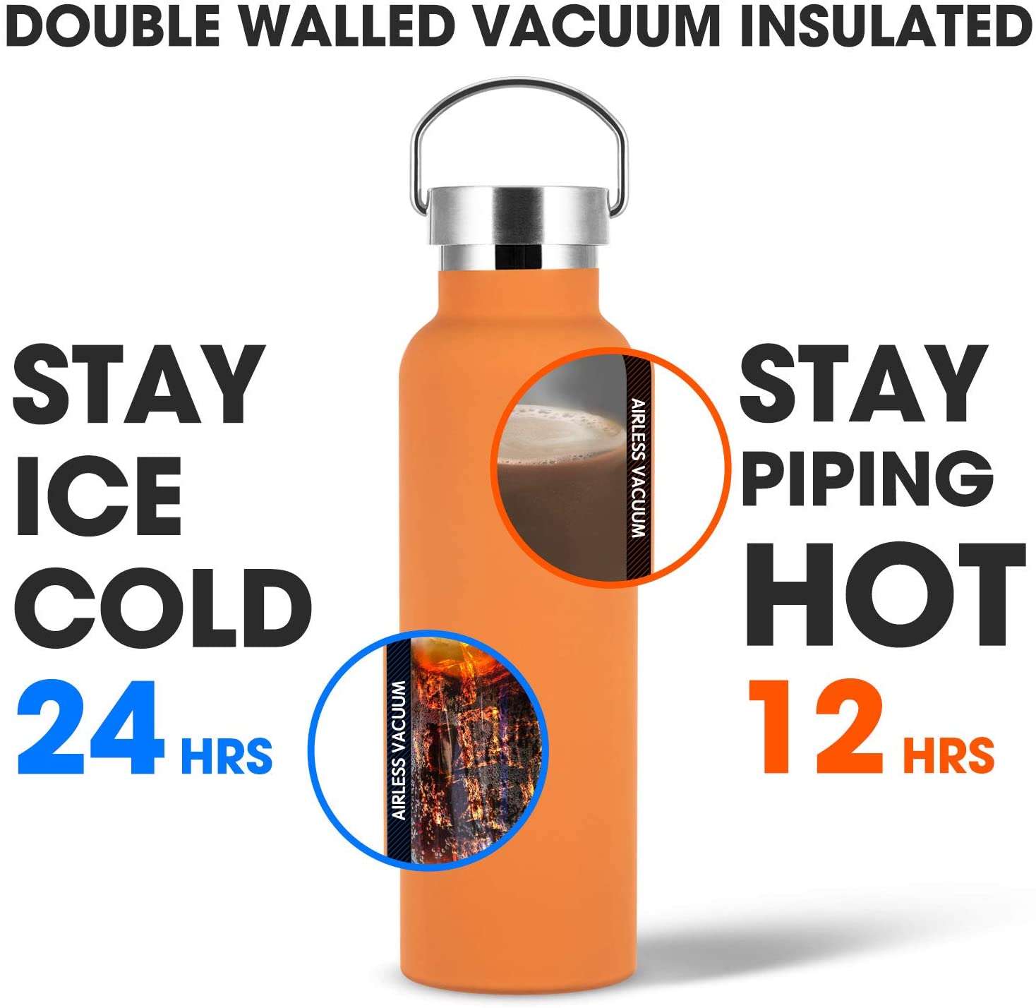 - Aislamiento de vacío: la botella de agua de acero inoxidable aislada de vacío de doble pared premium Mantenga el agua fría y caliente durante hasta 24 horas, ¡no se "suda" en absoluto!