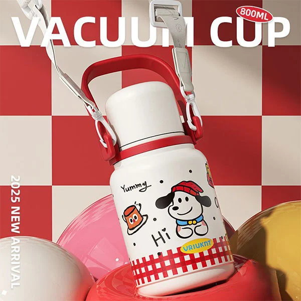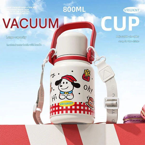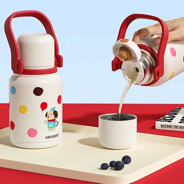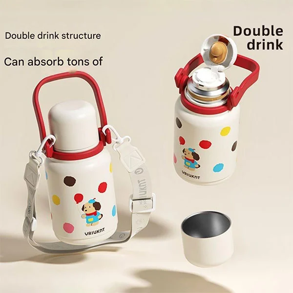 El termo apto para lavavajillas viene con un asa grande y una correa para el hombro, adecuada para que niños o adultos la levanten y liberen sus manos. La tapa también puede servir como vaso de agua.